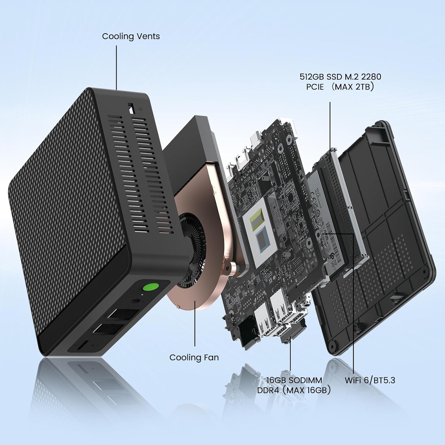 - √ 𝐂𝐨𝐨𝐥𝐢𝐧𝐠 𝐒𝐨𝐥𝐮𝐭𝐢𝐨𝐧𝐬 𝐈𝐧𝐜𝐫𝐞𝐚𝐬𝐞 𝐎𝐩𝐞𝐫𝐚𝐭𝐢𝐧𝐠 𝐒𝐩𝐞𝐞𝐝 -- The mini PC adopts metal aluminum blocks for heat conduction, effectively avoids local overheating, and strives to maximize the heat dissipation area. Add an 8010 ultra-quiet axial flow fan to quickly bring heat to improve system efficiency and reliability. The ultra-compact body design adopts an optimized and upgraded heat dissipation solution and combines with intelligent heat dissipation technology to keep bass running even under 100% load.